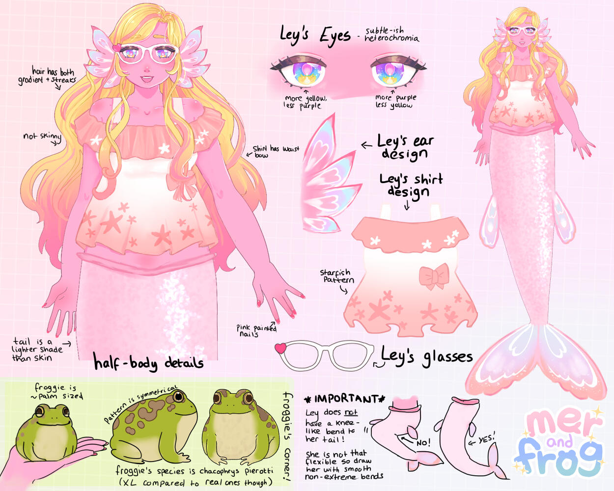 The two of them decided that livestreaming would be a fun solution that plays to their talents! Worried about the bad reputation of [REDACTED], Ley decided to wear a glamour of a closely resembled creature, a mermaid! And so, MerAndFrog was born!